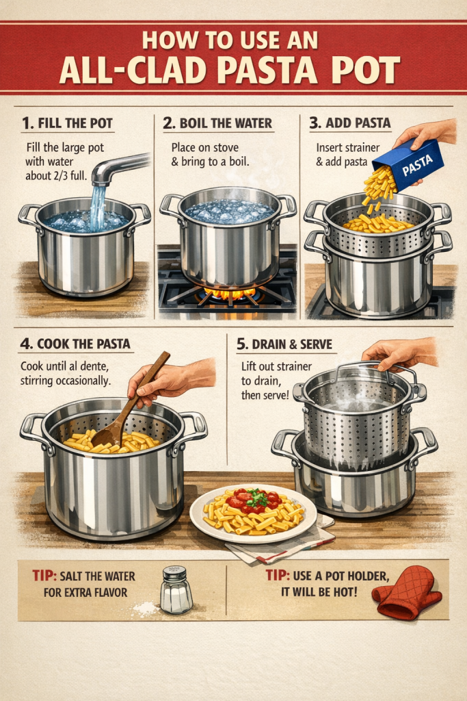 All-Clad pasta pot, perforated strainer insert, Simply Strain multipot, stainless steel stockpot, boiling water, salt timing, al dente pasta, steaming vegetables, shellfish, homemade stock, blanching — this is the complete guide to using every function of this pot correctly, from unboxing to long-term care.
