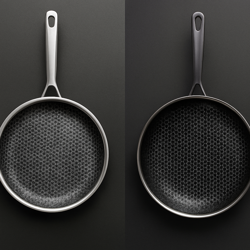 The Science: Hexagon’s solid stainless peaks have higher thermal mass and emissivity, promoting consistent Maillard reactions. HexClad’s peaks are aluminum-core under thin steel – they heat faster but lack the heat retention for proper crust formation before proteins seize up.