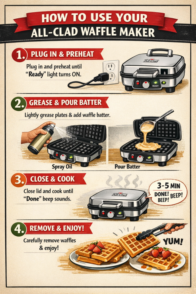 All-Clad waffle maker, PTFE nonstick plates, browning settings, preheat, batter volume, Belgian waffles, steam release, indicator lights, drip tray, removable plates — this guide covers every step of using an All-Clad waffle maker correctly, from unboxing to consistently excellent waffles, and every mistake in between.