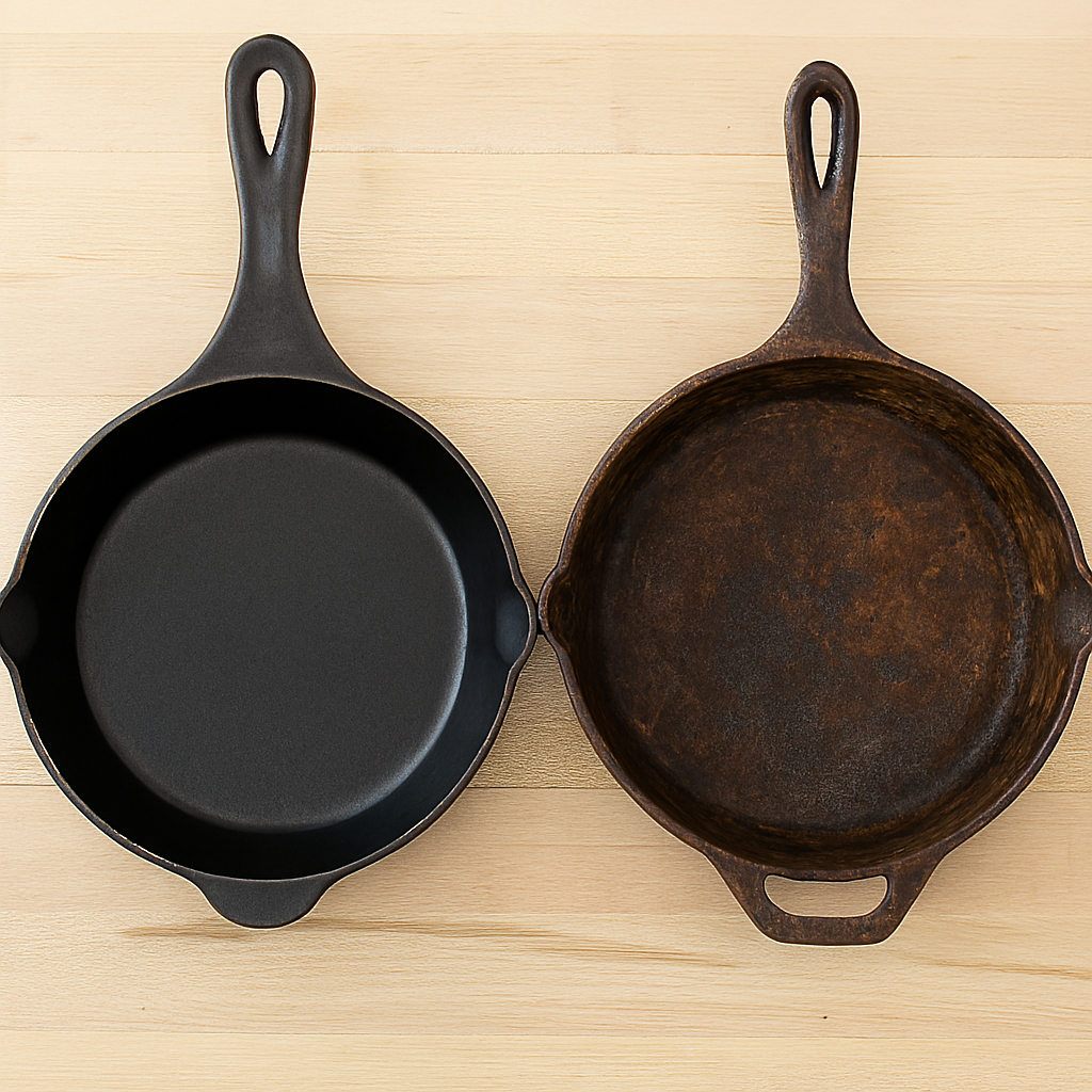 • Smithey: thin coats of grapeseed or avocado at 400–450 °F for 45–60 min. Repeat 4–6 cycles.